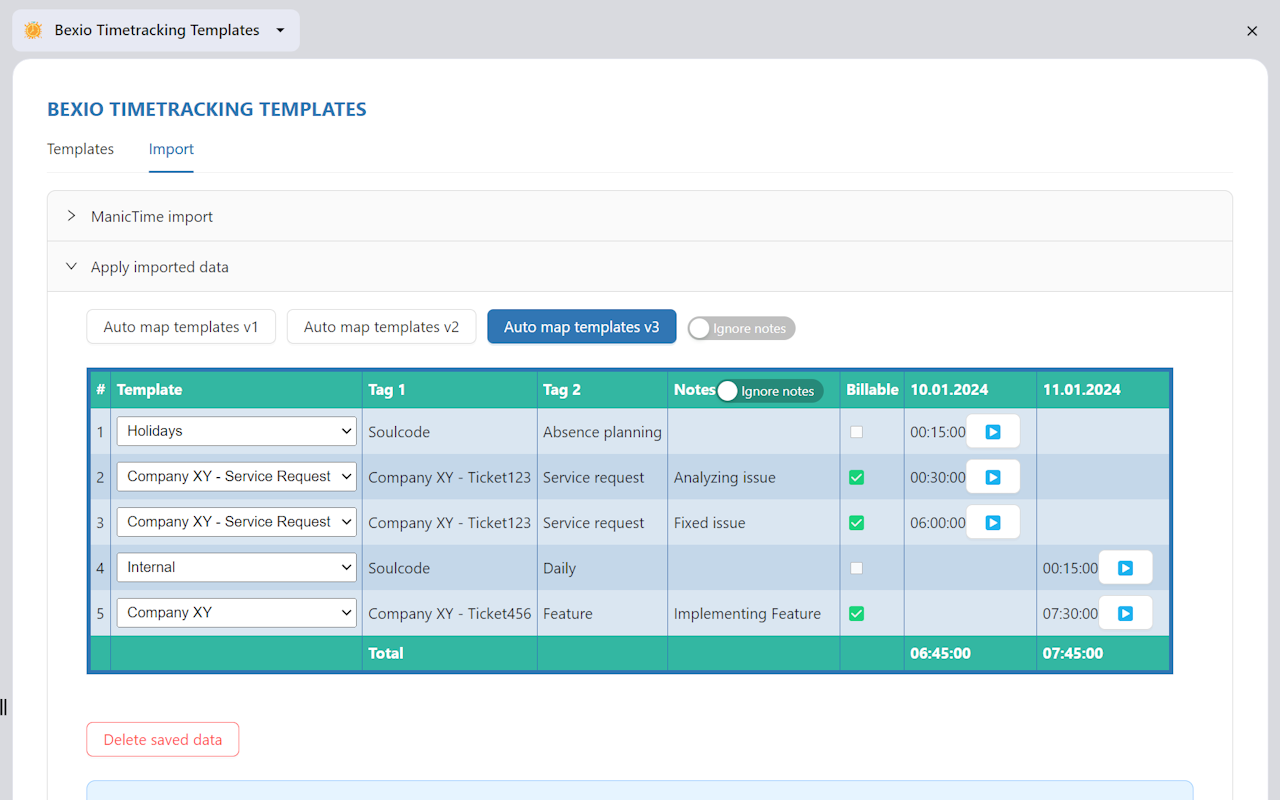 For users leveraging ManicTime for time tracking, the extension offers an import integration. You can import time entries from ManicTime and meticulously apply them step-by-step within bexio. From selecting templates to filling fields like contacts or projects, to specific time, date, and the billable checkbox, this feature ensures comprehensive form filling effortlessly.